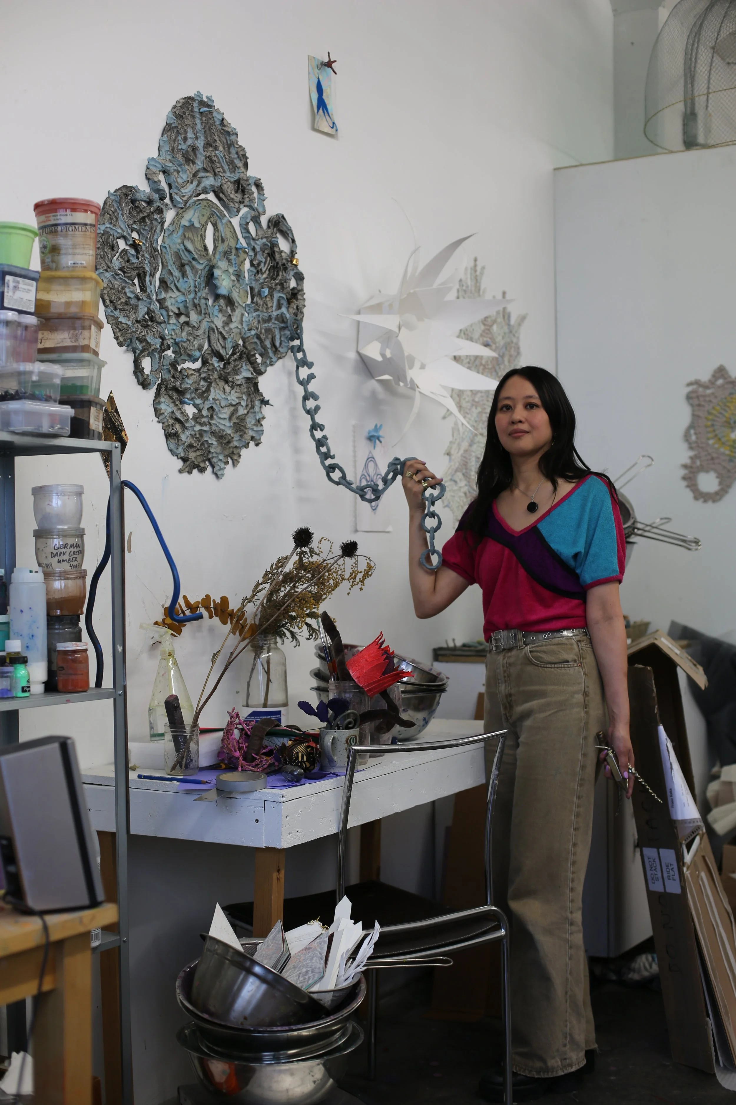 Jeanne Gaigher is a South African artist interested in the fluidity of subject matter, and how, through the act of painting, she can expand an object’s meaning. She explores the expressive potential of materials and their textures, taking her cue from a reflection on the traditional format of the painting and its canvas support. Her dreamlike, surreal narrations in which the female body takes center stage are created using fabric, gauze, painting, and drawing, emphasizing the tensions between the body and its context. Despite drawing from a broad reservoir of references, foreign and local, Gaigher consistently bases her thinking around place relative to her own presence in it. Rather than actual places, the settings portrayed are more a reflection of the subconscious dimension of ‘imaginary rooms.’ Never settling on figuration or abstraction, the artist moves nimbly between the two, focusing on the hybrid areas.